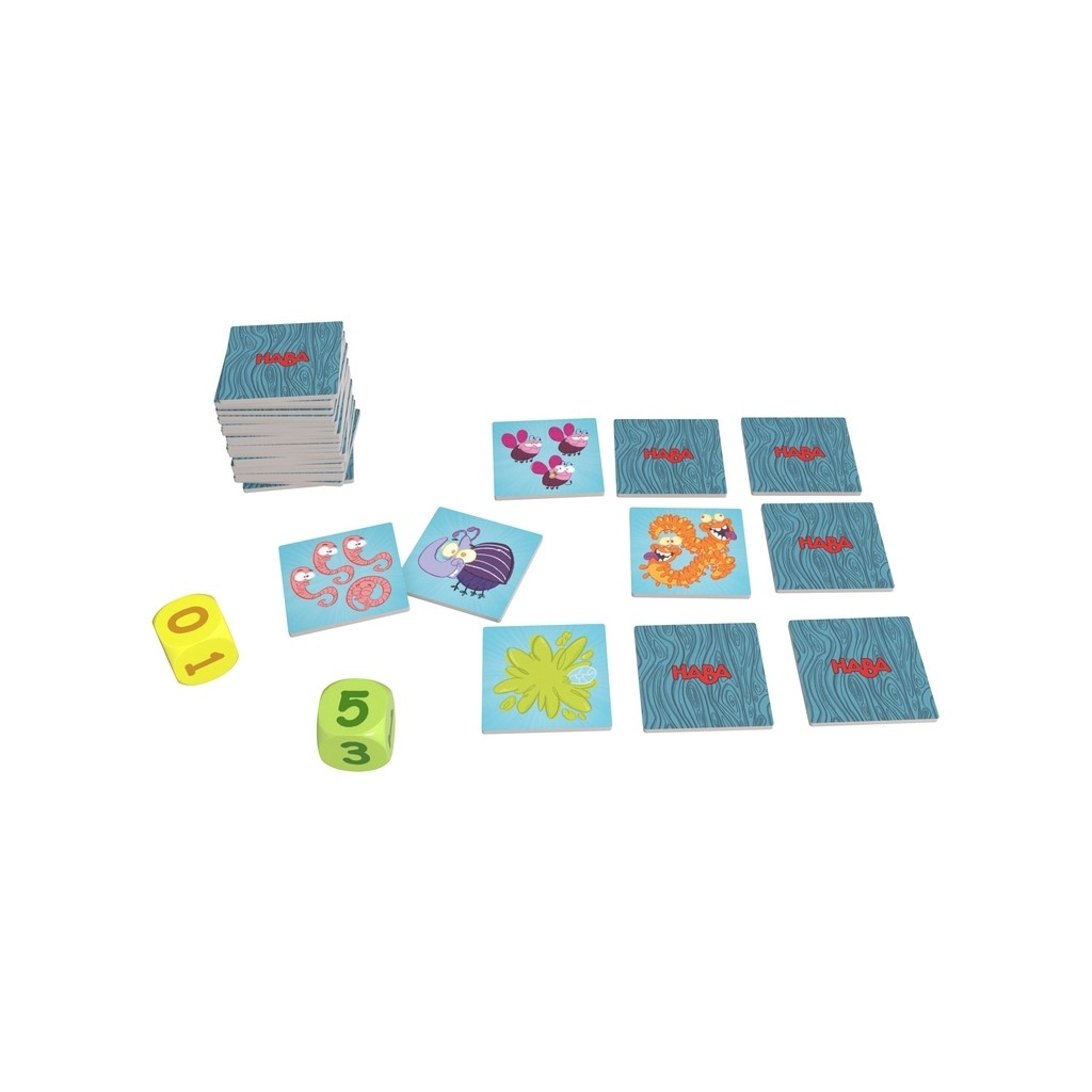 Retenez où se cachent les blattes, scarabées et autres insectes, car vous devez en trouver le nombre correspondant aux résultats des dés. Additionnez les petites bestioles retournées, mais veillez à ne pas en retourner trop!