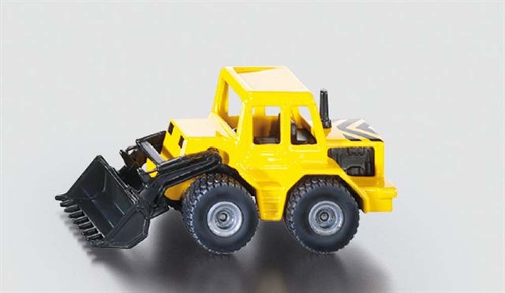 Une reproduction miniature en métal d’un tracto-pelle de la gamme SIKU.
